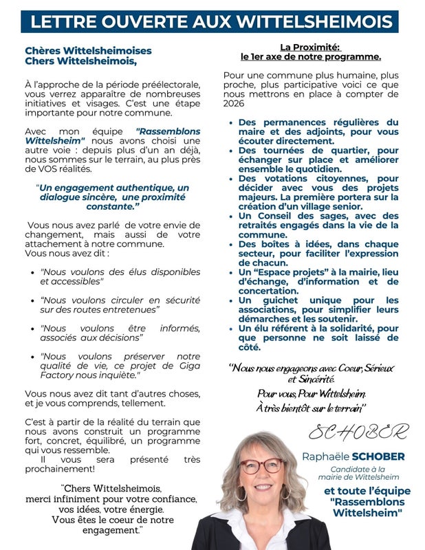 Ces derniers jours, nous avons distribué aux habitants de Wittelsheim une lettre ouverte présentant notre démarche et notre vision pour l’avenir de la commune.